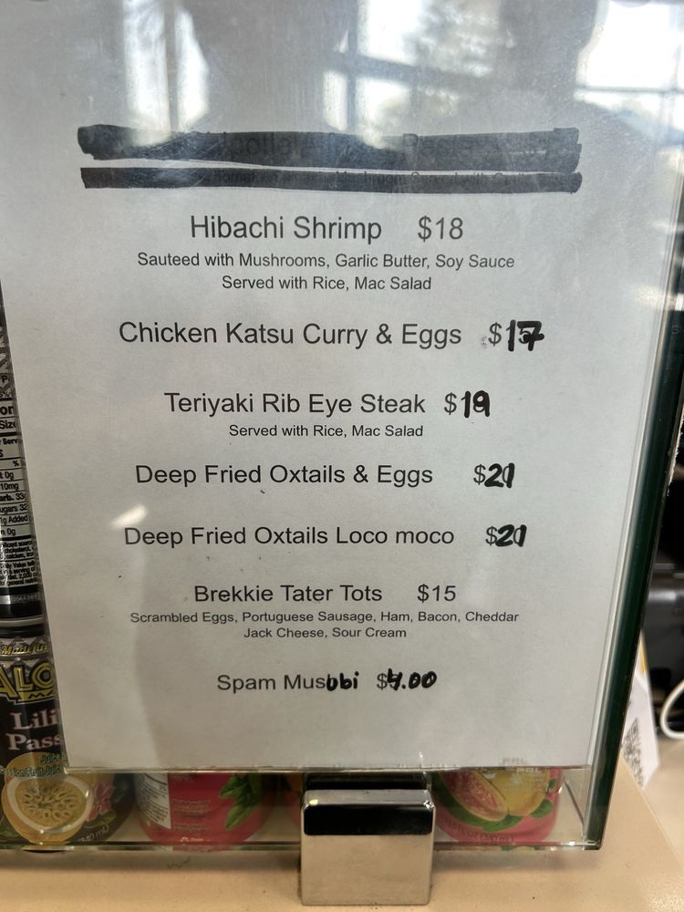 Hamburger patty, spam, chicken katsu, corned beef hash, or Portuguese sausage on steamed rice, topped with two eggs and brown gravy.