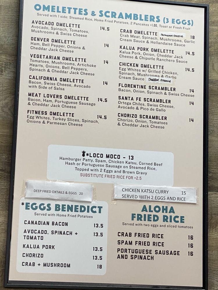 One choice of protein: bacon, Portuguese sausage, link or turkey sausage, mixed veggies, kalua pork, corned beef hash, or spam with scrambled eggs, cheddar jack cheese, and potatoes. Served with a side of salsa.